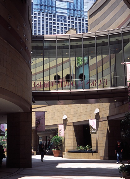 建物を箱型にせずカーヴをもたせてふたつに分離し、それらをガラス張りのブリッジで連結、真ん中に谷を思わせる通り(キャニオン・ストリート)を設けてあります。そのおかげで建物に陰影が生じ、被写体として面白いものになっています。また、通りや屋上からは遠くを臨めるようになっています。名前の通り、公園を思わせるように木々や花を植えてあって、ほとんどの時期に花が咲くようになっています。公園を専門に管理する庭師のような人もいます。