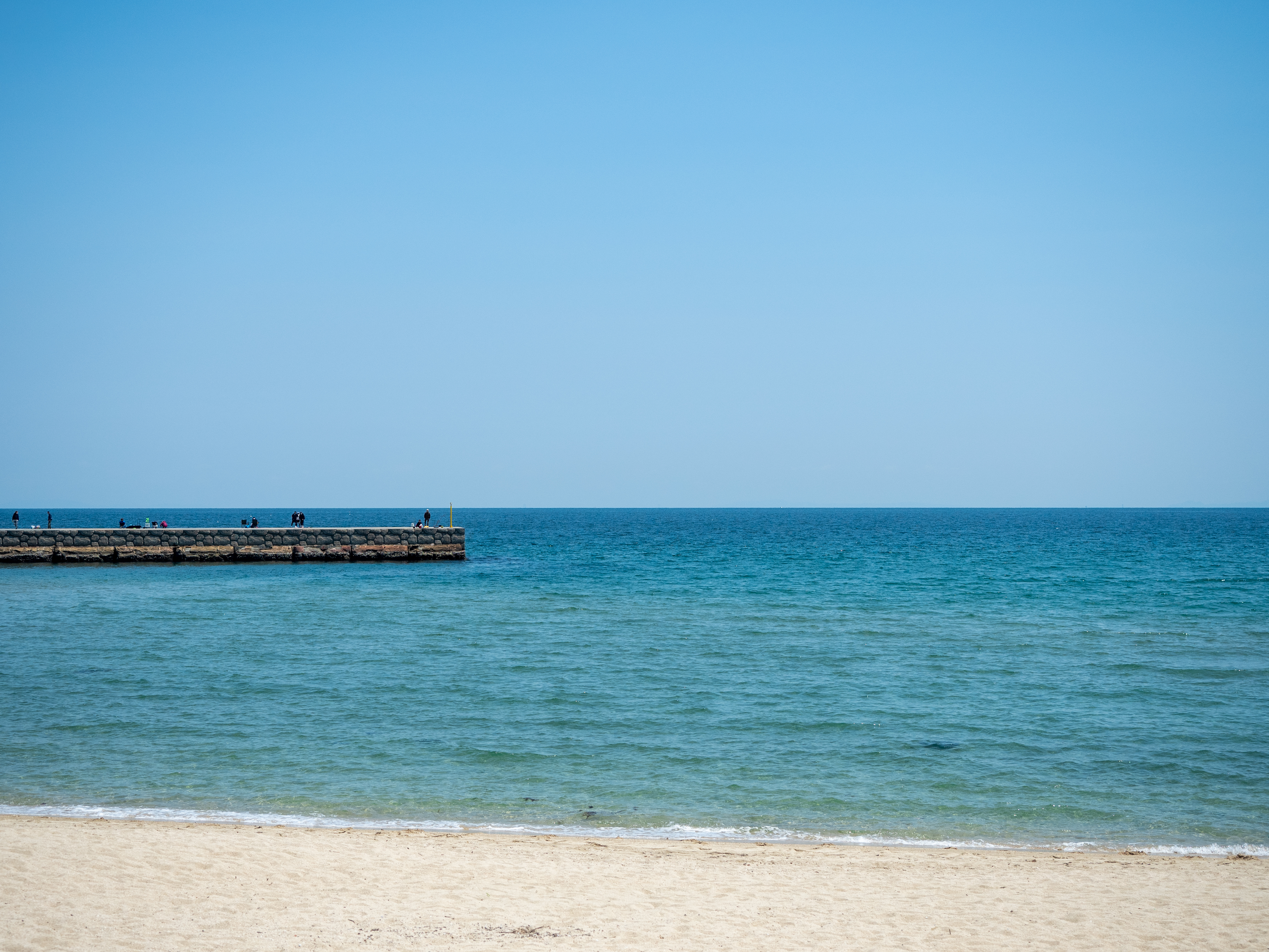 そのあと、妻が近くに海岸があることを知り、そこまで移動。とても綺麗な砂浜が広がっていました。大浜海水浴場というらしいです。さすがに海水浴には早いので、ちょっと足をつける程度。子どもたちはとても喜んでいました。早く出発した甲斐があるというものです。