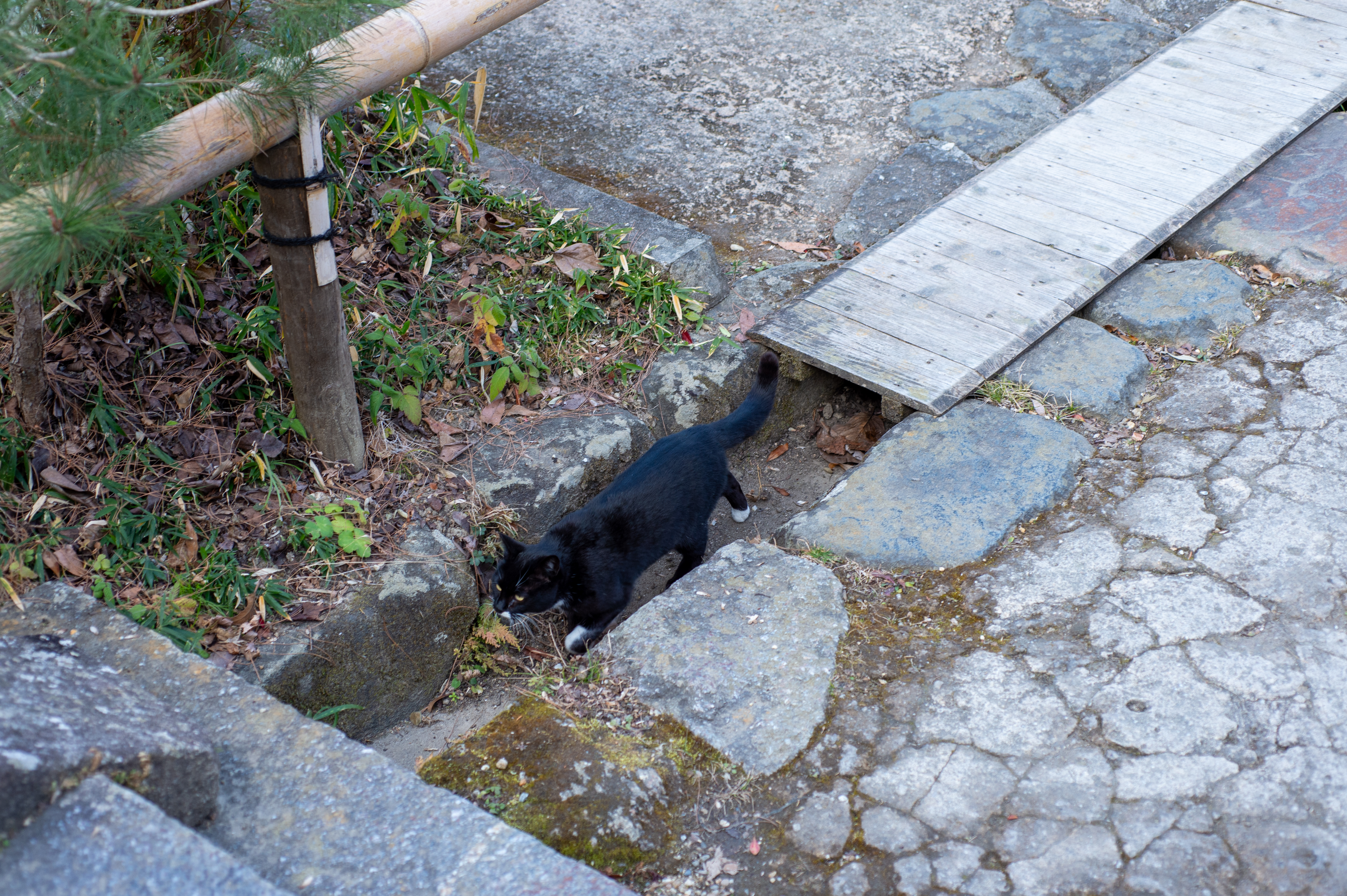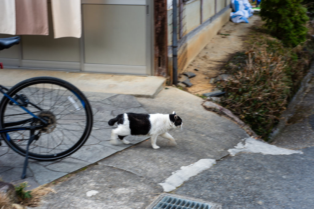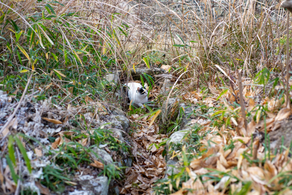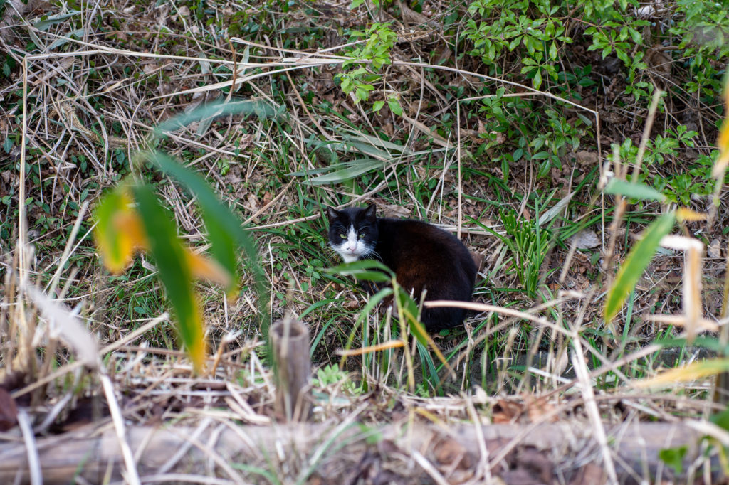 猫は人を見ても逃げませんが、近付いてもきません。こちらから近付いたら何か動きがあるのかも知れませんが、まあ絶妙な距離感で写真を撮らせてもらいます。飼い猫ではなく、きちんと管理された地域猫なんじゃないか、という印象を受けました。