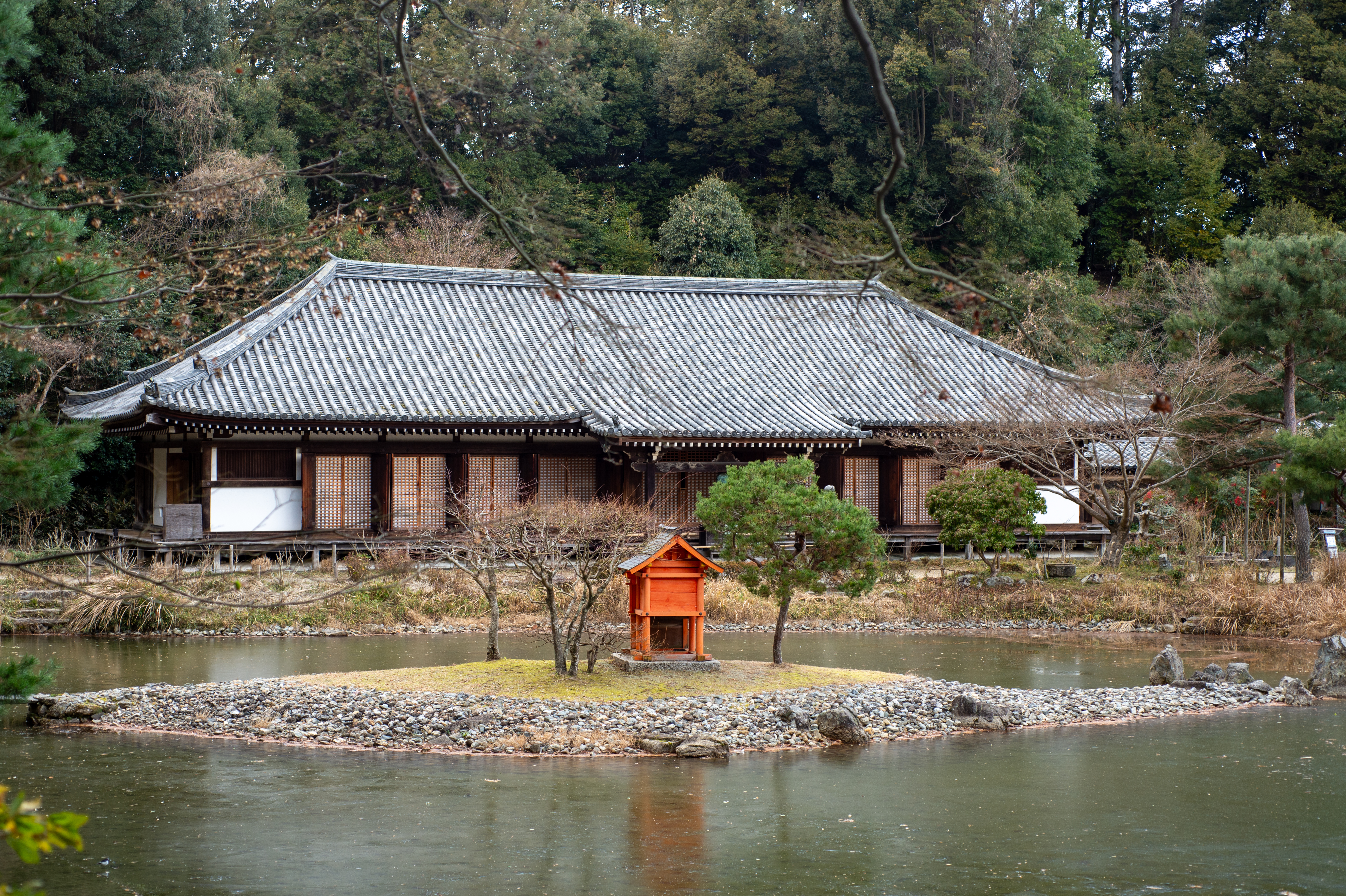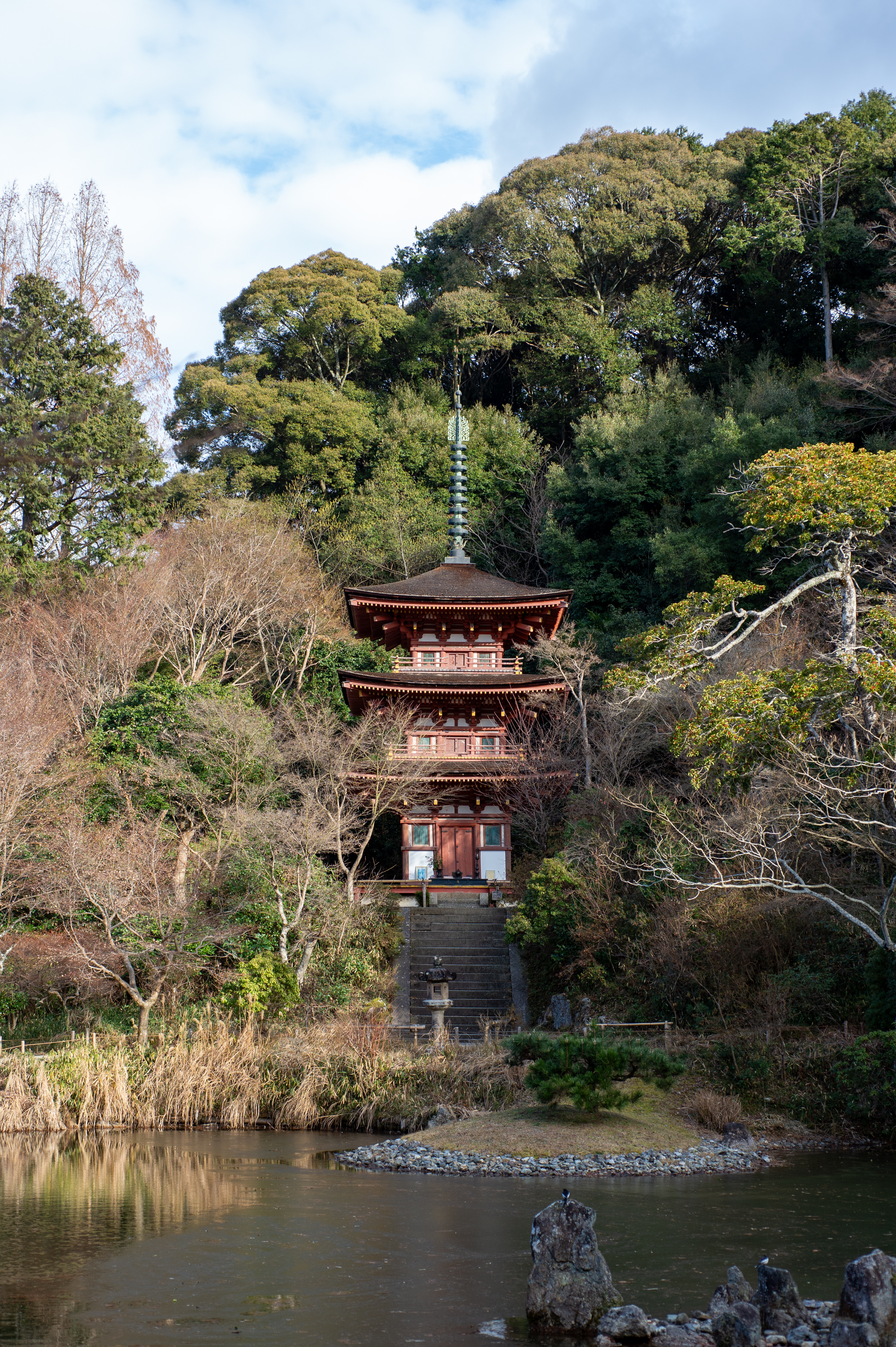 境内に入り、本堂の九体阿弥陀仏を拝見します。入り口で靴を脱ぐと、足が寒い。ものすごく寒い。ご焼香をさせていただくと、厳かな気持ちになりました。本堂を出て、もう一度お詣りをして、池をぐるっと回って、三重塔に向かいます。池が凍っています。氷の上を鳥が歩いています。餌になるような何かがいるんでしょうか。少し日が差したタイミングを逃さず三重塔を撮影できて満足です。