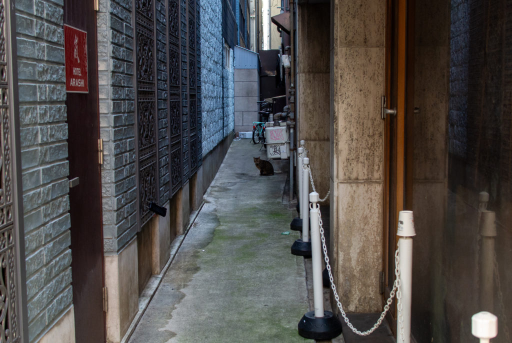 心斎橋に向かって、裏道みたいなところを北に歩いていると、猫が飛び出してきました。キジトラです。ラッキー。やっぱりいるんだ、とキョロキョロしていると、路地の奥で猫をワシワシしている女性を見つけました。女性がお店に入っても、逃げないので遠巻きに撮影。先ほど見た猫と似ている気がします。家族なのか、同じ猫なのか。もう少し大きく撮ろうと近付くと逃げました。