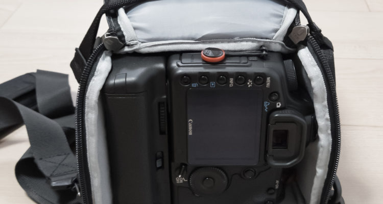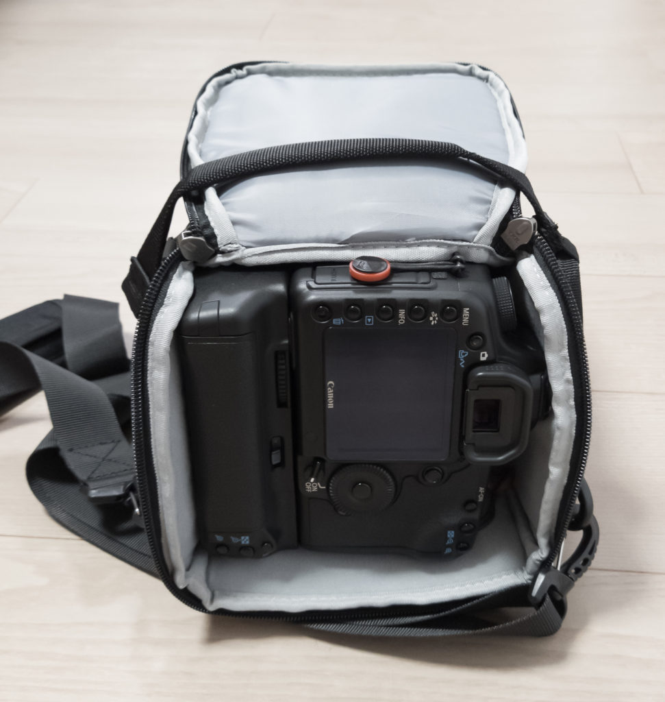 実際にカメラを収納してみたのが上の画像。70-200mm F2.8クラスのレンズほどに大きいレンズは持っていないので、奥行方向には余裕がありますが、開口部はぴったりサイズです。奥行方向の余裕は、手持ちのレンズならフードを取り付けたまま収納できるだろう点や、奥に撮影グッズを入れておけるだろう点で便利なんじゃないかと思いまして。実際、現物を確認すると想像したとおりの使い方ができて満足です。
